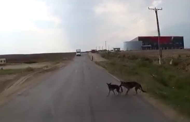 Description : En Russie, une chienne va sortir in extremis son petit d'une route pour lui éviter une mort certaine. Bravo madame.