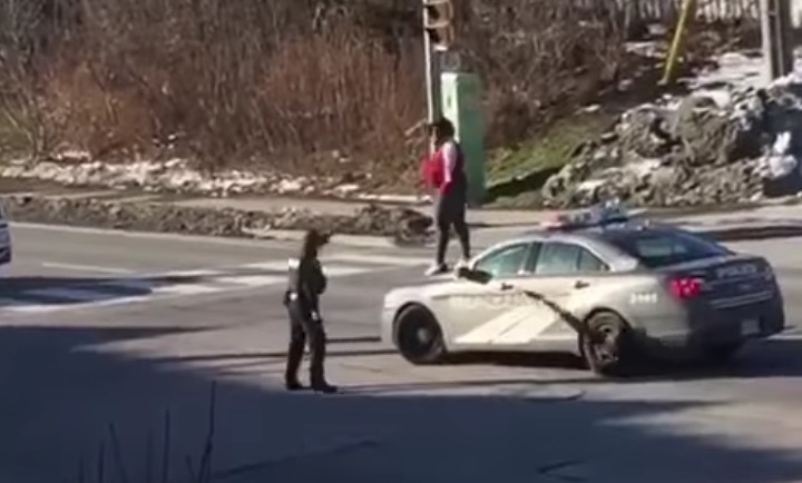 Description : A Toronto (Canada) une femme qui a pété un fusible a grimpé sur une voiture de police pour péter le pare-brise avec ses pieds.