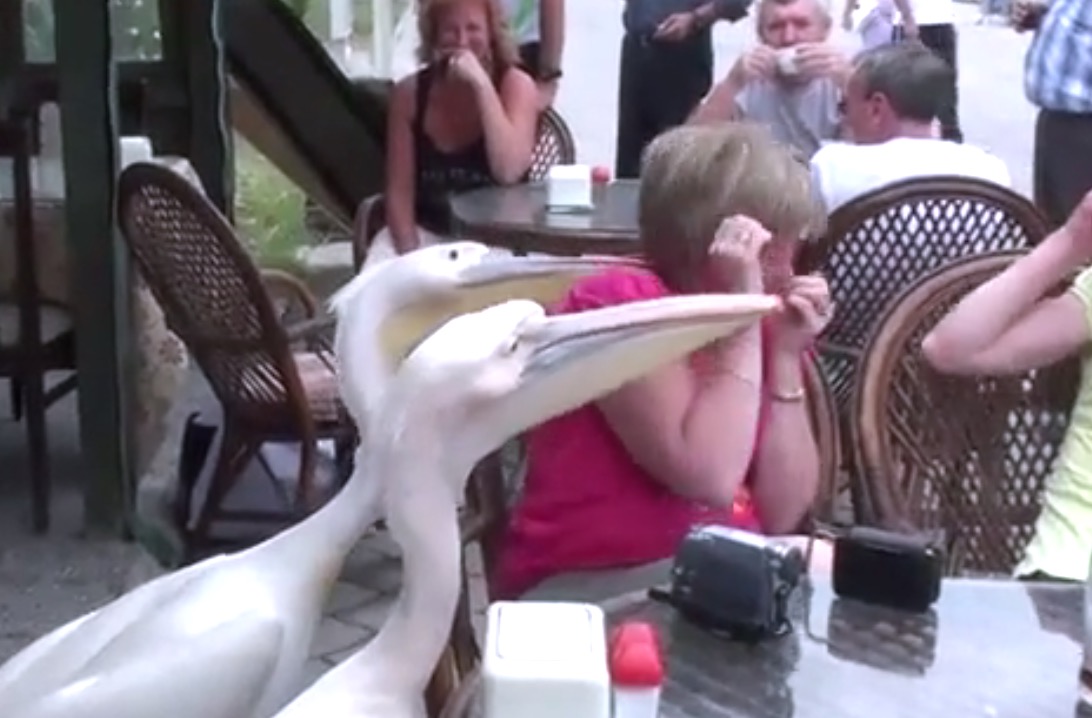 Description : Sur la terrasse deux pélicans en manque vont faire les gros lourds avec une cliente.