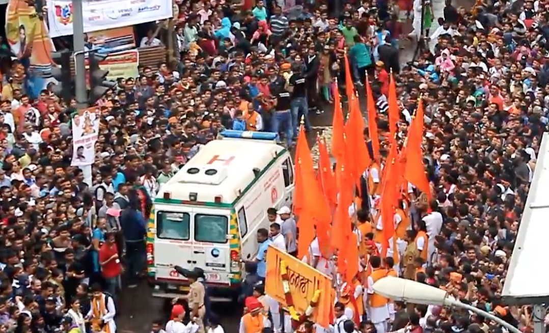 Description : A Pune en Inde pendant la Fête de Ganesh, une ambulance se retrouve coincée au milieu d'une énorme foule, heureusement l'ambiance était au beau fixe et le véhicule a pu se frayer un chemin très facilement. Des images comme on aimerait en voir plus souvent.