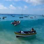 Une vague détruit un petit bateau
